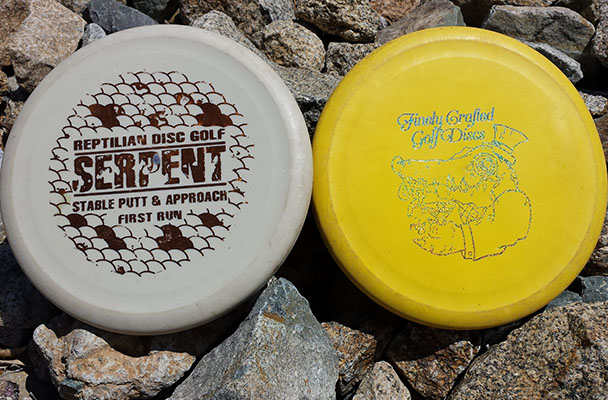The Reptilian Disc Golf Serpent (white) and Scale (yellow) are both deep putters that make for a nice one-two punch.